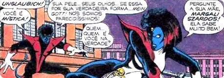 Isso foi algo que já havia mencionado quando falei sobre a minissérie Dias de Um Futuro Esquecido. Há uma cena em que Mística e Noturno estão lutando um contra o outro e Kurt se surpreende ao ver que Mística é quase igual a ele. Mesma cor de pele e cor dos olhos. Isso o faz querer saber porquê ela é igual a ele e a mutante só responde para ele perguntar à sua mãe. Quem assistia a X-Men Evolution no SBT sabe que eles são mãe e filho. Sim, e? Se vocês se lembram do filme, quando Mercúrio resgata Magneto da prisão no subsolo do Pentágono, há uma sequência no elevador em que Mercúrio fala algo sobre a mãe dele ter conhecido um cara que controlava metais. Além disso, quando Erik ataca o pronunciamento do presidente, é mostrada a reação da mãe de Pietro, evidentemente preocupada.